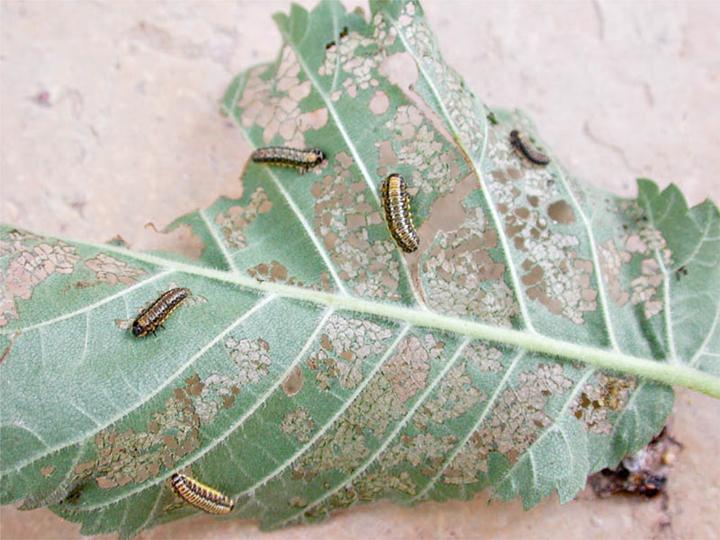 Early season symptom's (August to November appear as shot holes in leaves and skeletonisation and discoloration of foliage occurs at the peak of infestation (December to February). Severely damaged trees may be completely defoliated. Consecutive years of defoliation an cause limb dieback and may lead to whole tree decline.